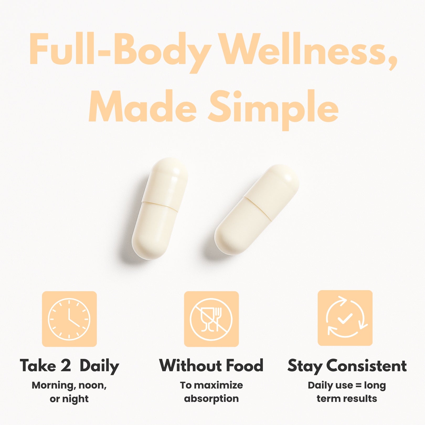 We recommend taking 2-3 capsules daily - preferably on an empty stomach to maximize absorption and bioavailability of the bioactive compounds.