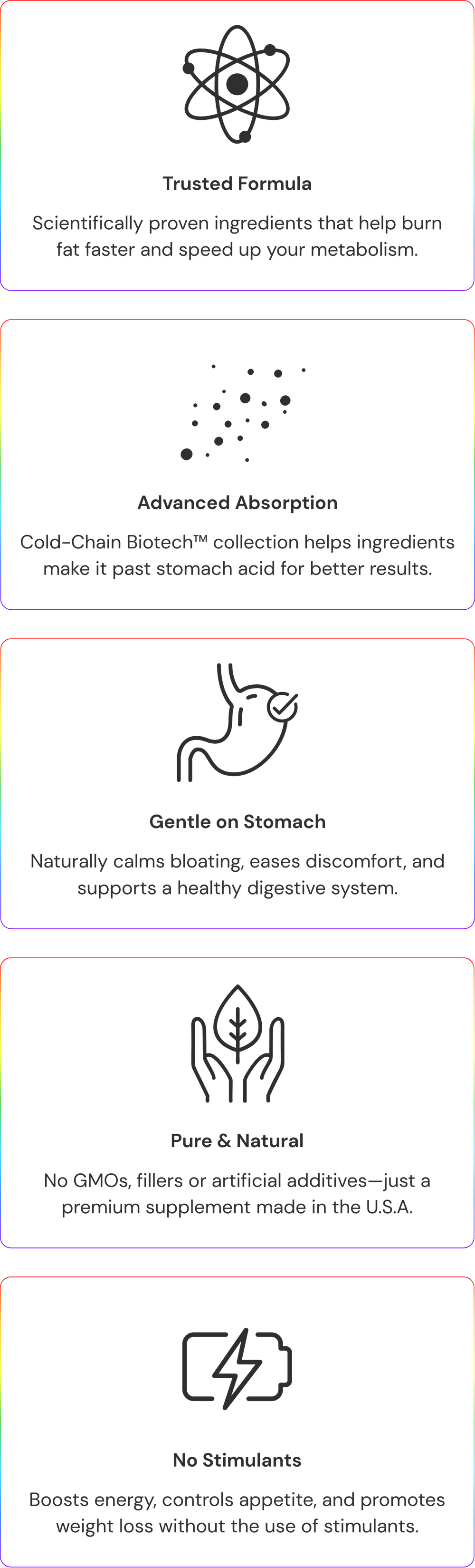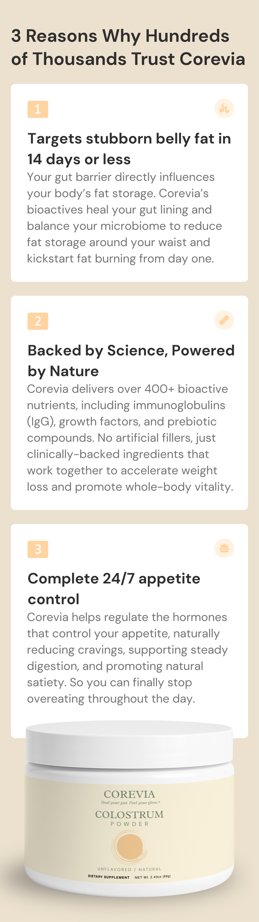 Corevia isn’t a fat burner or a weight-loss powder. It’s a premium colostrum formula crafted to help strengthen the gut barrier, ease bloating, restore whole-body vitality, and support your body’s natural fat-burning rhythm. When your gut is repaired, the body can better regulate appetite, energy, and metabolism. Unlike fat-burning powders, Corevia contains zero stimulants — so you won’t deal with jitters, crashes, nausea, dizziness, or headaches commonly associated with those products.